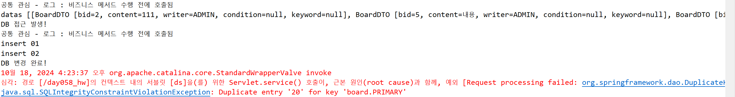 심각: 경로 [/day058_hw]의 컨텍스트 내의 서블릿 [ds]을(를) 위한 Servlet.service() 호출이, 근본 원인(root cause)과 함께, 예외 [Request processing failed: org.springframework.dao.DuplicateKeyException: PreparedStatementCallback; SQL [INSERT INTO BOARD (BID,CONTENT,WRITER) VALUES(?,?,?)]; Duplicate entry '20' for key 'board.PRIMARY']을(를) 발생시켰습니다.