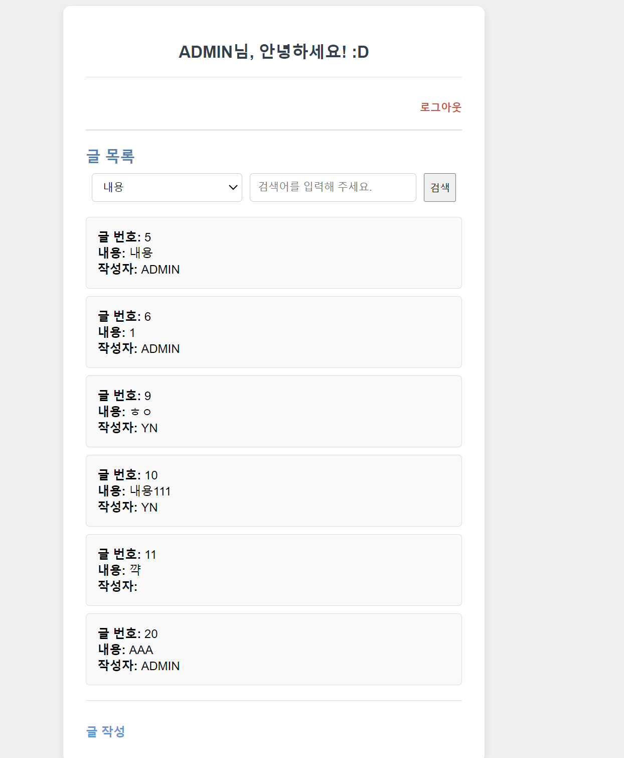 내가 만든 간단한 게시판 페이지인데, 111이라는 내용은 찾을 수 없다.
