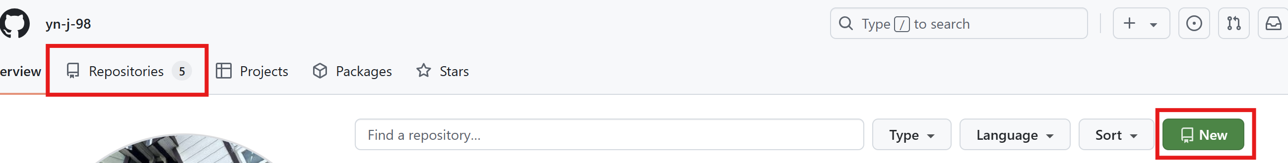 내 Repositories로 들어가서 , New를 클릭해서 먼저 repository를 만들 준비를 한다.