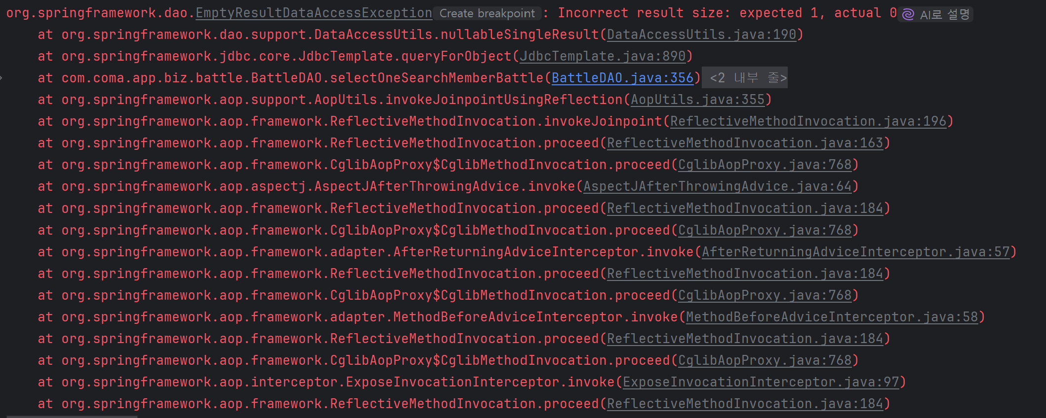 result = jdbcTemplate.queryForObject(SEARCH_MEMBER_BATTLE, args, new BattleRowMapperOneSearchMemberBattle());