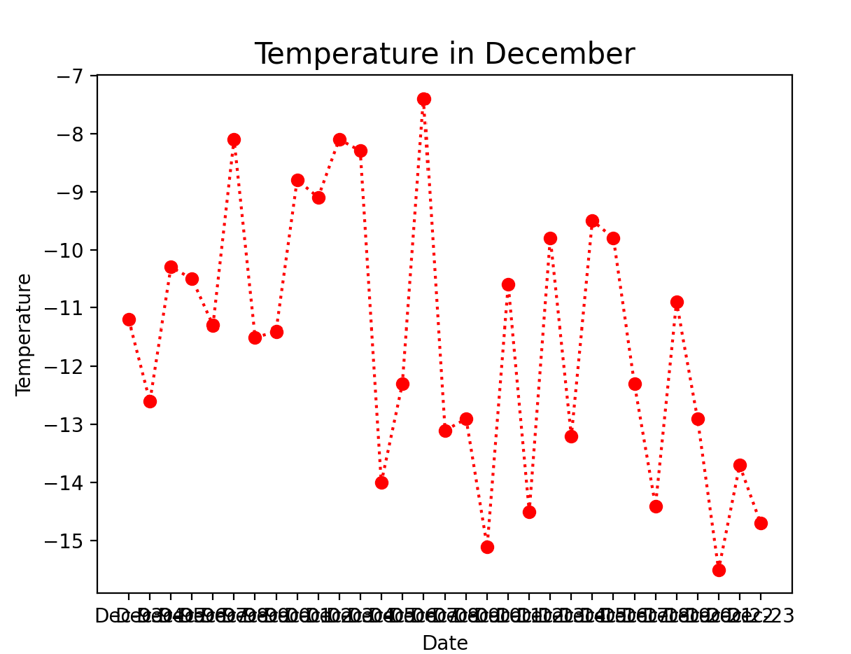 plt.plot(dates,temps,marker='o',color='r',linestyle=':') # 선