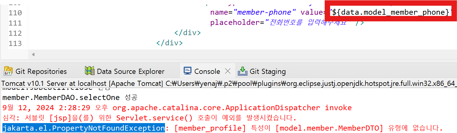 jsp - EL식에서 작성한 변수명이 서버와 데이터쪽에서 작성한 변수명이랑 같지 않아서( == 없어서 ) 유형에 없다고 뜨는 오류이다.