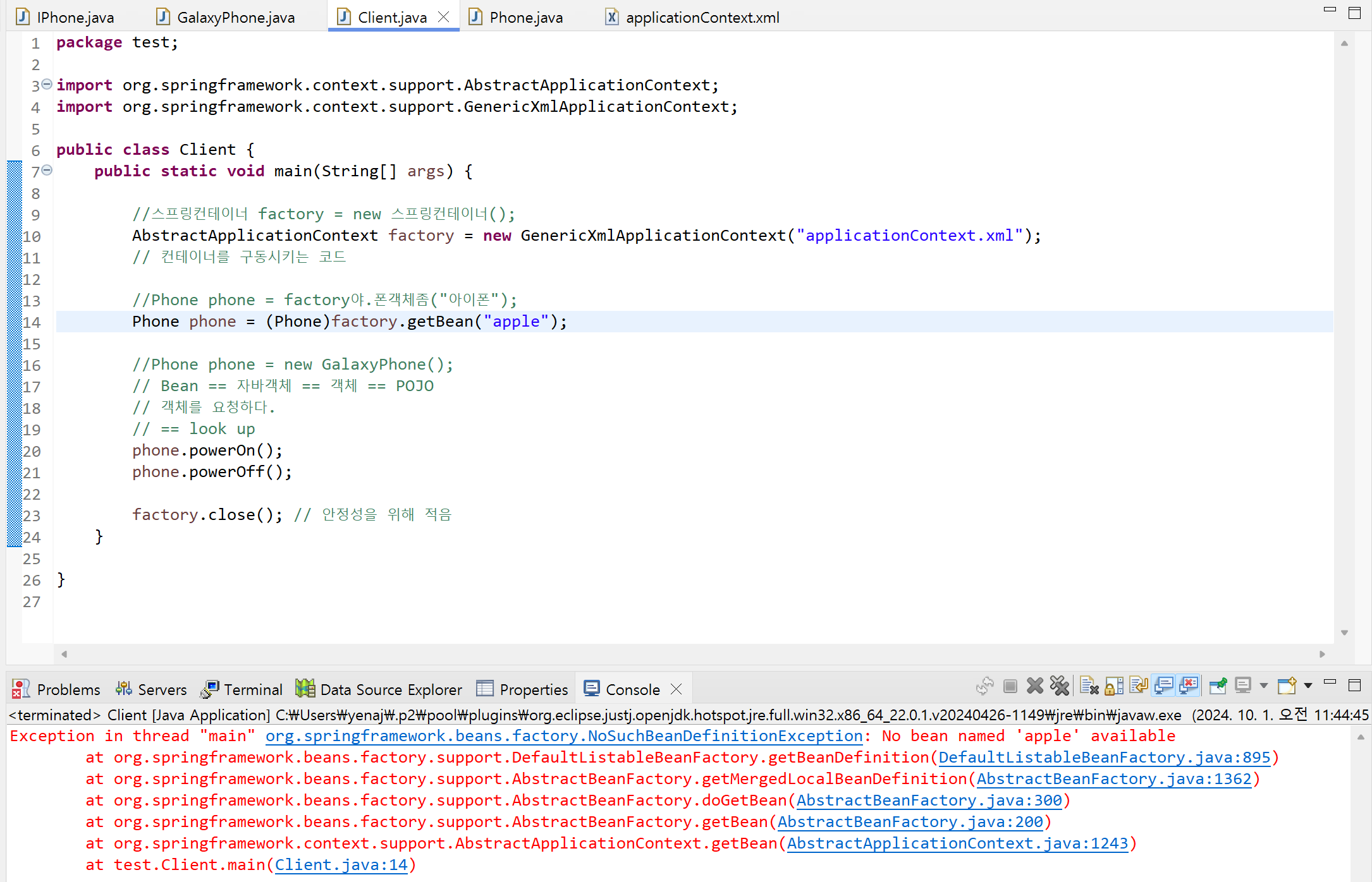 NoSuchBeanDefinitionException 해당 오류가 발생한 이유는 .xml에서 설정한 내용중 apple이라는 객체가 없기 때문에 발생한 오류이다.